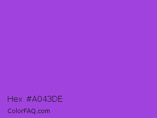 Hex #a043de Color is a normal purple color and the nearest color is Dark Orchid #9932cc. Hex code #a043de and RGB value is rgb(160,67,222). In RGB color space, this color is composed of 63% red, 26% green, 87% blue, In CMYK color space, this color is composed of 28% cyan, 70% magenta, 0% yellow , 13% black , In HSL color space, this color has a hue angle of 276° , 70% saturation and 57% lightness.
