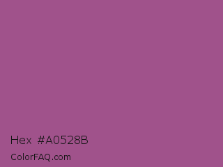Hex #a0528b Color is a normal magenta color and the nearest color is Antique Fuchsia #915c83. Hex code #a0528b and RGB value is rgb(160,82,139). In RGB color space, this color is composed of 63% red, 32% green, 55% blue, In CMYK color space, this color is composed of 0% cyan, 49% magenta, 13% yellow , 37% black , In HSL color space, this color has a hue angle of 316° , 32% saturation and 47% lightness.
