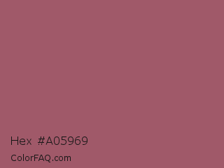 Hex #a05969 Color is a normal red color and the nearest color is Rose Dust #9e5e6f. Hex code #a05969 and RGB value is rgb(160,89,105). In RGB color space, this color is composed of 63% red, 35% green, 41% blue, In CMYK color space, this color is composed of 0% cyan, 44% magenta, 34% yellow , 37% black , In HSL color space, this color has a hue angle of 346° , 29% saturation and 49% lightness.
