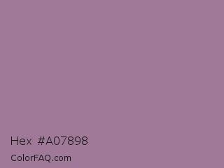 Hex #a07898 Color is a normal magenta color and the nearest color is Mountbatten Pink #997a8d. Hex code #a07898 and RGB value is rgb(160,120,152). In RGB color space, this color is composed of 63% red, 47% green, 60% blue, In CMYK color space, this color is composed of 0% cyan, 25% magenta, 5% yellow , 37% black , In HSL color space, this color has a hue angle of 312° , 17% saturation and 55% lightness.