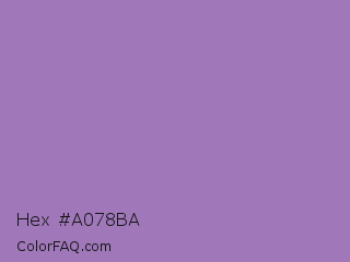 Hex #a078ba Color is a normal purple color and the nearest color is Purple Mountains Majesty #9678b6. Hex code #a078ba and RGB value is rgb(160,120,186). In RGB color space, this color is composed of 63% red, 47% green, 73% blue, In CMYK color space, this color is composed of 14% cyan, 35% magenta, 0% yellow , 27% black , In HSL color space, this color has a hue angle of 276° , 32% saturation and 60% lightness.