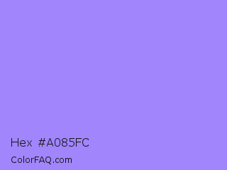 Hex #a085fc Color is a light indigo color and the nearest color is Dull Lavender #a899e6. Hex code #a085fc and RGB value is rgb(160,133,252). In RGB color space, this color is composed of 63% red, 52% green, 99% blue, In CMYK color space, this color is composed of 37% cyan, 47% magenta, 0% yellow , 1% black , In HSL color space, this color has a hue angle of 254° , 95% saturation and 75% lightness.