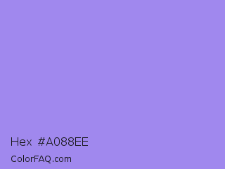 Hex #a088ee Color is a light indigo color and the nearest color is Dull Lavender #a899e6. Hex code #a088ee and RGB value is rgb(160,136,238). In RGB color space, this color is composed of 63% red, 53% green, 93% blue, In CMYK color space, this color is composed of 33% cyan, 43% magenta, 0% yellow , 7% black , In HSL color space, this color has a hue angle of 254° , 75% saturation and 73% lightness.