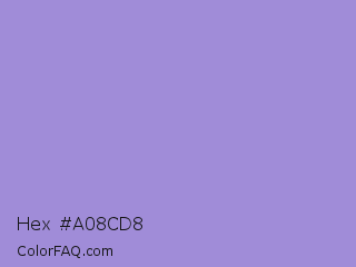 Hex #a08cd8 Color is a light indigo color and the nearest color is East Side #ac91ce. Hex code #a08cd8 and RGB value is rgb(160,140,216). In RGB color space, this color is composed of 63% red, 55% green, 85% blue, In CMYK color space, this color is composed of 26% cyan, 35% magenta, 0% yellow , 15% black , In HSL color space, this color has a hue angle of 256° , 49% saturation and 70% lightness.