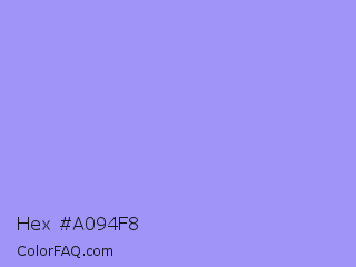 Hex #a094f8 Color is a light indigo color and the nearest color is Dull Lavender #a899e6. Hex code #a094f8 and RGB value is rgb(160,148,248). In RGB color space, this color is composed of 63% red, 58% green, 97% blue, In CMYK color space, this color is composed of 35% cyan, 40% magenta, 0% yellow , 3% black , In HSL color space, this color has a hue angle of 247° , 88% saturation and 78% lightness.