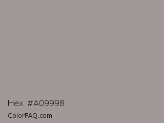 Hex #a09998 Color is a light red color and the nearest color is Star Dust #9f9f9c. Hex code #a09998 and RGB value is rgb(160,153,152). In RGB color space, this color is composed of 63% red, 60% green, 60% blue, In CMYK color space, this color is composed of 0% cyan, 4% magenta, 5% yellow , 37% black , In HSL color space, this color has a hue angle of 7° , 4% saturation and 61% lightness.