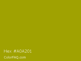 Hex #a0a201 Color is a normal yellow color and the nearest color is Apple Green #8db600. Hex code #a0a201 and RGB value is rgb(160,162,1). In RGB color space, this color is composed of 63% red, 64% green, 0% blue, In CMYK color space, this color is composed of 1% cyan, 0% magenta, 99% yellow , 36% black , In HSL color space, this color has a hue angle of 61° , 99% saturation and 32% lightness.