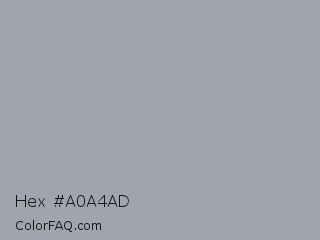 Hex #a0a4ad Color is a light blue color and the nearest color is Santas Gray #9fa0b1. Hex code #a0a4ad and RGB value is rgb(160,164,173). In RGB color space, this color is composed of 63% red, 64% green, 68% blue, In CMYK color space, this color is composed of 8% cyan, 5% magenta, 0% yellow , 32% black , In HSL color space, this color has a hue angle of 222° , 7% saturation and 65% lightness.
