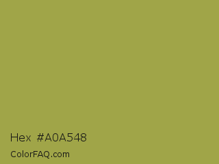 Hex #a0a548 Color is a normal yellow color and the nearest color is Brass #b5a642. Hex code #a0a548 and RGB value is rgb(160,165,72). In RGB color space, this color is composed of 63% red, 65% green, 28% blue, In CMYK color space, this color is composed of 3% cyan, 0% magenta, 56% yellow , 35% black , In HSL color space, this color has a hue angle of 63° , 39% saturation and 46% lightness.