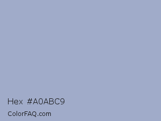 Hex #a0abc9 Color is a light blue color and the nearest color is Rock Blue #9eb1cd. Hex code #a0abc9 and RGB value is rgb(160,171,201). In RGB color space, this color is composed of 63% red, 67% green, 79% blue, In CMYK color space, this color is composed of 20% cyan, 15% magenta, 0% yellow , 21% black , In HSL color space, this color has a hue angle of 224° , 28% saturation and 71% lightness.