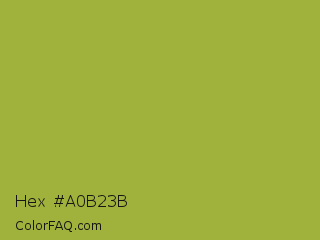 Hex #a0b23b Color is a normal yellow color and the nearest color is Android Green #a4c639. Hex code #a0b23b and RGB value is rgb(160,178,59). In RGB color space, this color is composed of 63% red, 70% green, 23% blue, In CMYK color space, this color is composed of 10% cyan, 0% magenta, 67% yellow , 30% black , In HSL color space, this color has a hue angle of 69° , 50% saturation and 46% lightness.