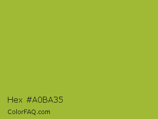 Hex #a0ba35 Color is a normal lime color and the nearest color is Android Green #a4c639. Hex code #a0ba35 and RGB value is rgb(160,186,53). In RGB color space, this color is composed of 63% red, 73% green, 21% blue, In CMYK color space, this color is composed of 14% cyan, 0% magenta, 72% yellow , 27% black , In HSL color space, this color has a hue angle of 72° , 56% saturation and 47% lightness.