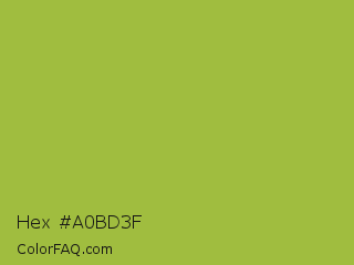 Hex #a0bd3f Color is a normal lime color and the nearest color is Android Green #a4c639. Hex code #a0bd3f and RGB value is rgb(160,189,63). In RGB color space, this color is composed of 63% red, 74% green, 25% blue, In CMYK color space, this color is composed of 15% cyan, 0% magenta, 67% yellow , 26% black , In HSL color space, this color has a hue angle of 74° , 50% saturation and 49% lightness.