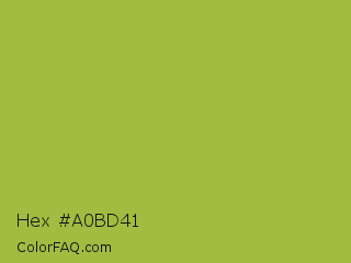 Hex #a0bd41 Color is a normal lime color and the nearest color is Android Green #a4c639. Hex code #a0bd41 and RGB value is rgb(160,189,65). In RGB color space, this color is composed of 63% red, 74% green, 25% blue, In CMYK color space, this color is composed of 15% cyan, 0% magenta, 66% yellow , 26% black , In HSL color space, this color has a hue angle of 74° , 49% saturation and 50% lightness.
