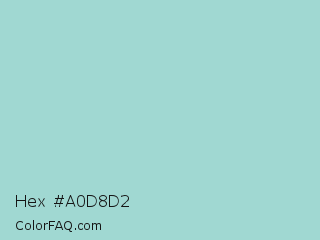 Hex #a0d8d2 Color is a light cyan color and the nearest color is Sinbad #9fd7d3. Hex code #a0d8d2 and RGB value is rgb(160,216,210). In RGB color space, this color is composed of 63% red, 85% green, 82% blue, In CMYK color space, this color is composed of 26% cyan, 0% magenta, 3% yellow , 15% black , In HSL color space, this color has a hue angle of 174° , 42% saturation and 74% lightness.