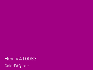 Hex #a10083 Color is a normal magenta color and the nearest color is Flirt #a2006d. Hex code #a10083 and RGB value is rgb(161,0,131). In RGB color space, this color is composed of 63% red, 0% green, 51% blue, In CMYK color space, this color is composed of 0% cyan, 100% magenta, 19% yellow , 37% black , In HSL color space, this color has a hue angle of 311° , 100% saturation and 32% lightness.
