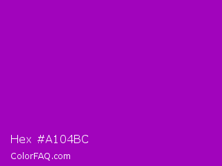 Hex #a104bc Color is a normal purple color and the nearest color is Heliotrope Magenta #aa00bb. Hex code #a104bc and RGB value is rgb(161,4,188). In RGB color space, this color is composed of 63% red, 2% green, 74% blue, In CMYK color space, this color is composed of 14% cyan, 98% magenta, 0% yellow , 26% black , In HSL color space, this color has a hue angle of 291° , 96% saturation and 38% lightness.