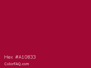 Hex #a10833 Color is a normal rose color and the nearest color is Pink Raspberry #980036. Hex code #a10833 and RGB value is rgb(161,8,51). In RGB color space, this color is composed of 63% red, 3% green, 20% blue, In CMYK color space, this color is composed of 0% cyan, 95% magenta, 68% yellow , 37% black , In HSL color space, this color has a hue angle of 343° , 91% saturation and 33% lightness.