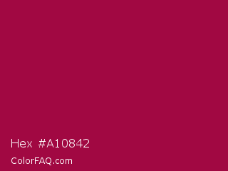 Hex #a10842 Color is a normal rose color and the nearest color is Pink Raspberry #980036. Hex code #a10842 and RGB value is rgb(161,8,66). In RGB color space, this color is composed of 63% red, 3% green, 26% blue, In CMYK color space, this color is composed of 0% cyan, 95% magenta, 59% yellow , 37% black , In HSL color space, this color has a hue angle of 337° , 91% saturation and 33% lightness.