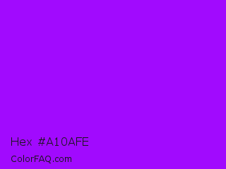 Hex #a10afe Color is a normal purple color and the nearest color is Vivid Violet #9f00ff. Hex code #a10afe and RGB value is rgb(161,10,254). In RGB color space, this color is composed of 63% red, 4% green, 100% blue, In CMYK color space, this color is composed of 37% cyan, 96% magenta, 0% yellow , 0% black , In HSL color space, this color has a hue angle of 277° , 99% saturation and 52% lightness.