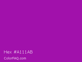 Hex #a111ab Color is a normal magenta color and the nearest color is Violet Eggplant #991199. Hex code #a111ab and RGB value is rgb(161,17,171). In RGB color space, this color is composed of 63% red, 7% green, 67% blue, In CMYK color space, this color is composed of 6% cyan, 90% magenta, 0% yellow , 33% black , In HSL color space, this color has a hue angle of 296° , 82% saturation and 37% lightness.