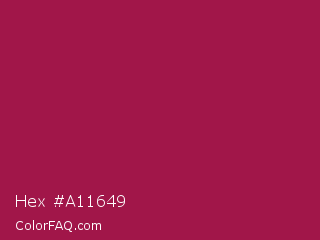 Hex #a11649 Color is a normal rose color and the nearest color is French Wine #ac1e44. Hex code #a11649 and RGB value is rgb(161,22,73). In RGB color space, this color is composed of 63% red, 9% green, 29% blue, In CMYK color space, this color is composed of 0% cyan, 86% magenta, 55% yellow , 37% black , In HSL color space, this color has a hue angle of 338° , 76% saturation and 36% lightness.