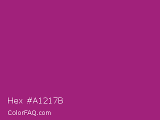 Hex #a1217b Color is a normal magenta color and the nearest color is Amaranth Deep Purple #9f2b68. Hex code #a1217b and RGB value is rgb(161,33,123). In RGB color space, this color is composed of 63% red, 13% green, 48% blue, In CMYK color space, this color is composed of 0% cyan, 80% magenta, 24% yellow , 37% black , In HSL color space, this color has a hue angle of 318° , 66% saturation and 38% lightness.