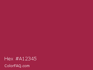 Hex #a12345 Color is a normal rose color and the nearest color is Big Dip O Ruby #9c2542. Hex code #a12345 and RGB value is rgb(161,35,69). In RGB color space, this color is composed of 63% red, 14% green, 27% blue, In CMYK color space, this color is composed of 0% cyan, 78% magenta, 57% yellow , 37% black , In HSL color space, this color has a hue angle of 344° , 64% saturation and 38% lightness.