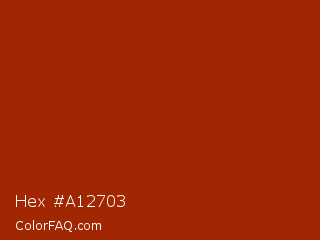 Hex #a12703 Color is a normal red color and the nearest color is Rufous #a81c07. Hex code #a12703 and RGB value is rgb(161,39,3). In RGB color space, this color is composed of 63% red, 15% green, 1% blue, In CMYK color space, this color is composed of 0% cyan, 76% magenta, 98% yellow , 37% black , In HSL color space, this color has a hue angle of 14° , 96% saturation and 32% lightness.