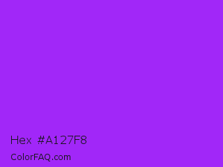 Hex #a127f8 Color is a normal purple color and the nearest color is Veronica #a020f0. Hex code #a127f8 and RGB value is rgb(161,39,248). In RGB color space, this color is composed of 63% red, 15% green, 97% blue, In CMYK color space, this color is composed of 35% cyan, 84% magenta, 0% yellow , 3% black , In HSL color space, this color has a hue angle of 275° , 94% saturation and 56% lightness.