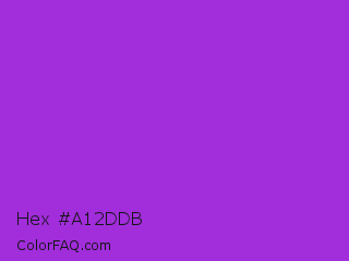 Hex #a12ddb Color is a normal purple color and the nearest color is Dark Orchid #9932cc. Hex code #a12ddb and RGB value is rgb(161,45,219). In RGB color space, this color is composed of 63% red, 18% green, 86% blue, In CMYK color space, this color is composed of 26% cyan, 79% magenta, 0% yellow , 14% black , In HSL color space, this color has a hue angle of 280° , 71% saturation and 52% lightness.