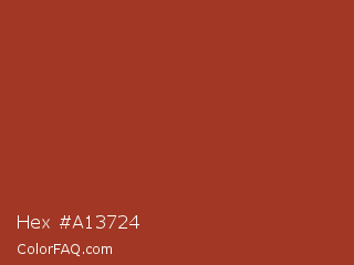 Hex #a13724 Color is a normal red color and the nearest color is Cognac #9f381d. Hex code #a13724 and RGB value is rgb(161,55,36). In RGB color space, this color is composed of 63% red, 22% green, 14% blue, In CMYK color space, this color is composed of 0% cyan, 66% magenta, 78% yellow , 37% black , In HSL color space, this color has a hue angle of 9° , 63% saturation and 39% lightness.
