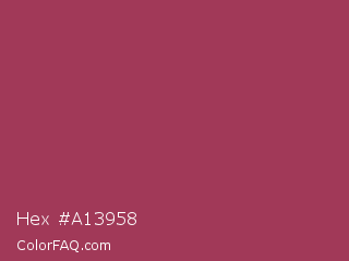 Hex #a13958 Color is a normal rose color and the nearest color is Night Shadz #aa375a. Hex code #a13958 and RGB value is rgb(161,57,88). In RGB color space, this color is composed of 63% red, 22% green, 35% blue, In CMYK color space, this color is composed of 0% cyan, 65% magenta, 45% yellow , 37% black , In HSL color space, this color has a hue angle of 342° , 48% saturation and 43% lightness.