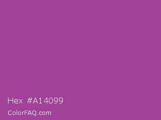 Hex #a14099 Color is a normal magenta color and the nearest color is Purpureus #9a4eae. Hex code #a14099 and RGB value is rgb(161,64,153). In RGB color space, this color is composed of 63% red, 25% green, 60% blue, In CMYK color space, this color is composed of 0% cyan, 60% magenta, 5% yellow , 37% black , In HSL color space, this color has a hue angle of 305° , 43% saturation and 44% lightness.