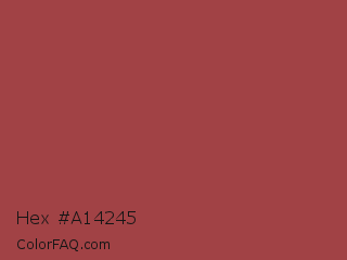 Hex #a14245 Color is a normal red color and the nearest color is Copper Rust #944747. Hex code #a14245 and RGB value is rgb(161,66,69). In RGB color space, this color is composed of 63% red, 26% green, 27% blue, In CMYK color space, this color is composed of 0% cyan, 59% magenta, 57% yellow , 37% black , In HSL color space, this color has a hue angle of 358° , 42% saturation and 45% lightness.