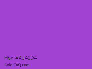 Hex #a142d4 Color is a normal purple color and the nearest color is Dark Orchid #9932cc. Hex code #a142d4 and RGB value is rgb(161,66,212). In RGB color space, this color is composed of 63% red, 26% green, 83% blue, In CMYK color space, this color is composed of 24% cyan, 69% magenta, 0% yellow , 17% black , In HSL color space, this color has a hue angle of 279° , 63% saturation and 55% lightness.