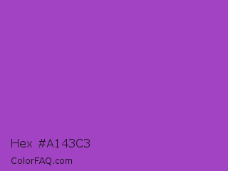 Hex #a143c3 Color is a normal purple color and the nearest color is Purple Plum #9c51b6. Hex code #a143c3 and RGB value is rgb(161,67,195). In RGB color space, this color is composed of 63% red, 26% green, 76% blue, In CMYK color space, this color is composed of 17% cyan, 66% magenta, 0% yellow , 24% black , In HSL color space, this color has a hue angle of 284° , 52% saturation and 51% lightness.