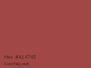 Hex #a14745 Color is a normal red color and the nearest color is Copper Rust #944747. Hex code #a14745 and RGB value is rgb(161,71,69). In RGB color space, this color is composed of 63% red, 28% green, 27% blue, In CMYK color space, this color is composed of 0% cyan, 56% magenta, 57% yellow , 37% black , In HSL color space, this color has a hue angle of 1° , 40% saturation and 45% lightness.
