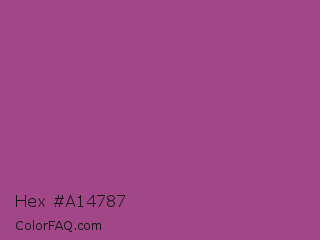Hex #a14787 Color is a normal magenta color and the nearest color is Magenta Haze #9f4576. Hex code #a14787 and RGB value is rgb(161,71,135). In RGB color space, this color is composed of 63% red, 28% green, 53% blue, In CMYK color space, this color is composed of 0% cyan, 56% magenta, 16% yellow , 37% black , In HSL color space, this color has a hue angle of 317° , 39% saturation and 45% lightness.