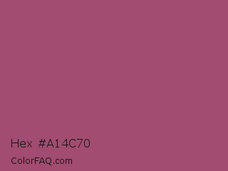Hex #a14c70 Color is a normal rose color and the nearest color is China Rose #a8516e. Hex code #a14c70 and RGB value is rgb(161,76,112). In RGB color space, this color is composed of 63% red, 30% green, 44% blue, In CMYK color space, this color is composed of 0% cyan, 53% magenta, 30% yellow , 37% black , In HSL color space, this color has a hue angle of 335° , 36% saturation and 46% lightness.