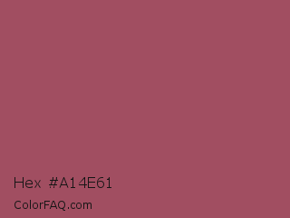 Hex #a14e61 Color is a normal red color and the nearest color is China Rose #a8516e. Hex code #a14e61 and RGB value is rgb(161,78,97). In RGB color space, this color is composed of 63% red, 31% green, 38% blue, In CMYK color space, this color is composed of 0% cyan, 52% magenta, 40% yellow , 37% black , In HSL color space, this color has a hue angle of 346° , 35% saturation and 47% lightness.