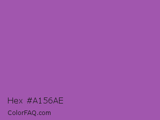 Hex #a156ae Color is a normal purple color and the nearest color is Purpureus #9a4eae. Hex code #a156ae and RGB value is rgb(161,86,174). In RGB color space, this color is composed of 63% red, 34% green, 68% blue, In CMYK color space, this color is composed of 7% cyan, 51% magenta, 0% yellow , 32% black , In HSL color space, this color has a hue angle of 291° , 35% saturation and 51% lightness.