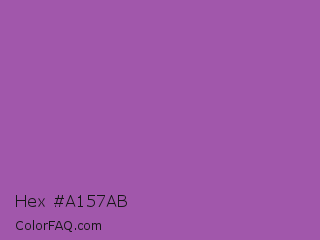 Hex #a157ab Color is a normal magenta color and the nearest color is Purpureus #9a4eae. Hex code #a157ab and RGB value is rgb(161,87,171). In RGB color space, this color is composed of 63% red, 34% green, 67% blue, In CMYK color space, this color is composed of 6% cyan, 49% magenta, 0% yellow , 33% black , In HSL color space, this color has a hue angle of 293° , 33% saturation and 51% lightness.