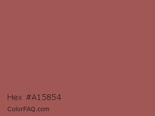 Hex #a15854 Color is a normal red color and the nearest color is Redwood #a45a52. Hex code #a15854 and RGB value is rgb(161,88,84). In RGB color space, this color is composed of 63% red, 35% green, 33% blue, In CMYK color space, this color is composed of 0% cyan, 45% magenta, 48% yellow , 37% black , In HSL color space, this color has a hue angle of 3° , 31% saturation and 48% lightness.