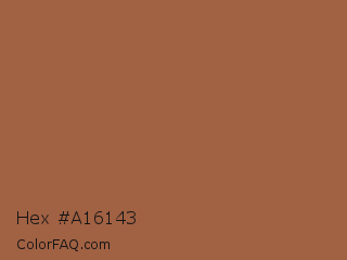 Hex #a16143 Color is a normal orange color and the nearest color is Cape Palliser #a26645. Hex code #a16143 and RGB value is rgb(161,97,67). In RGB color space, this color is composed of 63% red, 38% green, 26% blue, In CMYK color space, this color is composed of 0% cyan, 40% magenta, 58% yellow , 37% black , In HSL color space, this color has a hue angle of 19° , 41% saturation and 45% lightness.