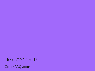 Hex #a169fb Color is a light violet color and the nearest color is Navy Purple #9457eb. Hex code #a169fb and RGB value is rgb(161,105,251). In RGB color space, this color is composed of 63% red, 41% green, 98% blue, In CMYK color space, this color is composed of 36% cyan, 58% magenta, 0% yellow , 2% black , In HSL color space, this color has a hue angle of 263° , 95% saturation and 70% lightness.