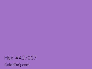 Hex #a170c7 Color is a light purple color and the nearest color is Rich Lavender #a76bcf. Hex code #a170c7 and RGB value is rgb(161,112,199). In RGB color space, this color is composed of 63% red, 44% green, 78% blue, In CMYK color space, this color is composed of 19% cyan, 44% magenta, 0% yellow , 22% black , In HSL color space, this color has a hue angle of 274° , 44% saturation and 61% lightness.