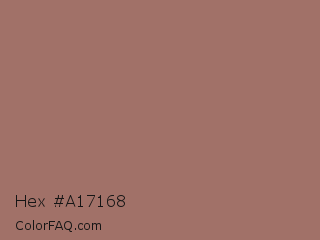 Hex #a17168 Color is a normal red color and the nearest color is Blast Off Bronze #a57164. Hex code #a17168 and RGB value is rgb(161,113,104). In RGB color space, this color is composed of 63% red, 44% green, 41% blue, In CMYK color space, this color is composed of 0% cyan, 30% magenta, 35% yellow , 37% black , In HSL color space, this color has a hue angle of 9° , 23% saturation and 52% lightness.
