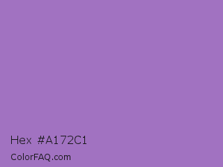 Hex #a172c1 Color is a normal purple color and the nearest color is Wisteria #9771b5. Hex code #a172c1 and RGB value is rgb(161,114,193). In RGB color space, this color is composed of 63% red, 45% green, 76% blue, In CMYK color space, this color is composed of 17% cyan, 41% magenta, 0% yellow , 24% black , In HSL color space, this color has a hue angle of 276° , 39% saturation and 60% lightness.