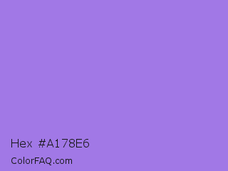 Hex #a178e6 Color is a light violet color and the nearest color is Medium Purple #9370db. Hex code #a178e6 and RGB value is rgb(161,120,230). In RGB color space, this color is composed of 63% red, 47% green, 90% blue, In CMYK color space, this color is composed of 30% cyan, 48% magenta, 0% yellow , 10% black , In HSL color space, this color has a hue angle of 262° , 69% saturation and 69% lightness.
